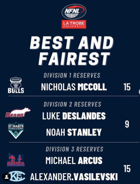 A huge congratulations to Noah Stanley for winning the NFNL Best & Fairest in Division 2 – Reserves!