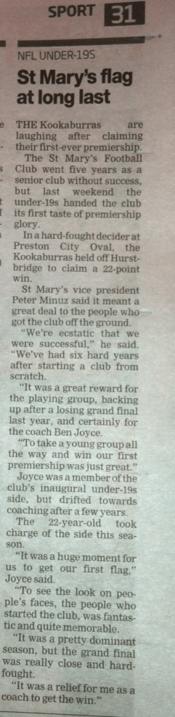 Ben Joyce, Under 19’s Coach 2013, quoted from Leader newspaper