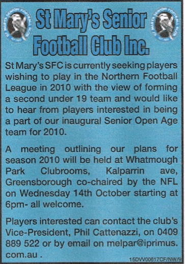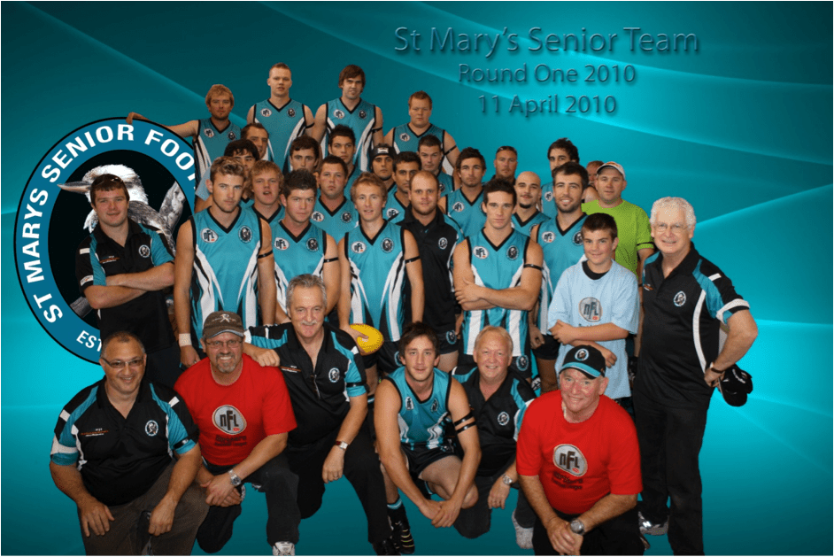 Tom Chapman, First Club President, quoted from the first club newsletter “Burra Banter”28 January 2009: St Mary’s Senior Football Club officially became part of the Northern Football League at their Annual General Meeting following a unanimous vote. The home ground was Kelynack Reserve (Whatmough was not in good enough condition) and the club started with one team – Under 19s.